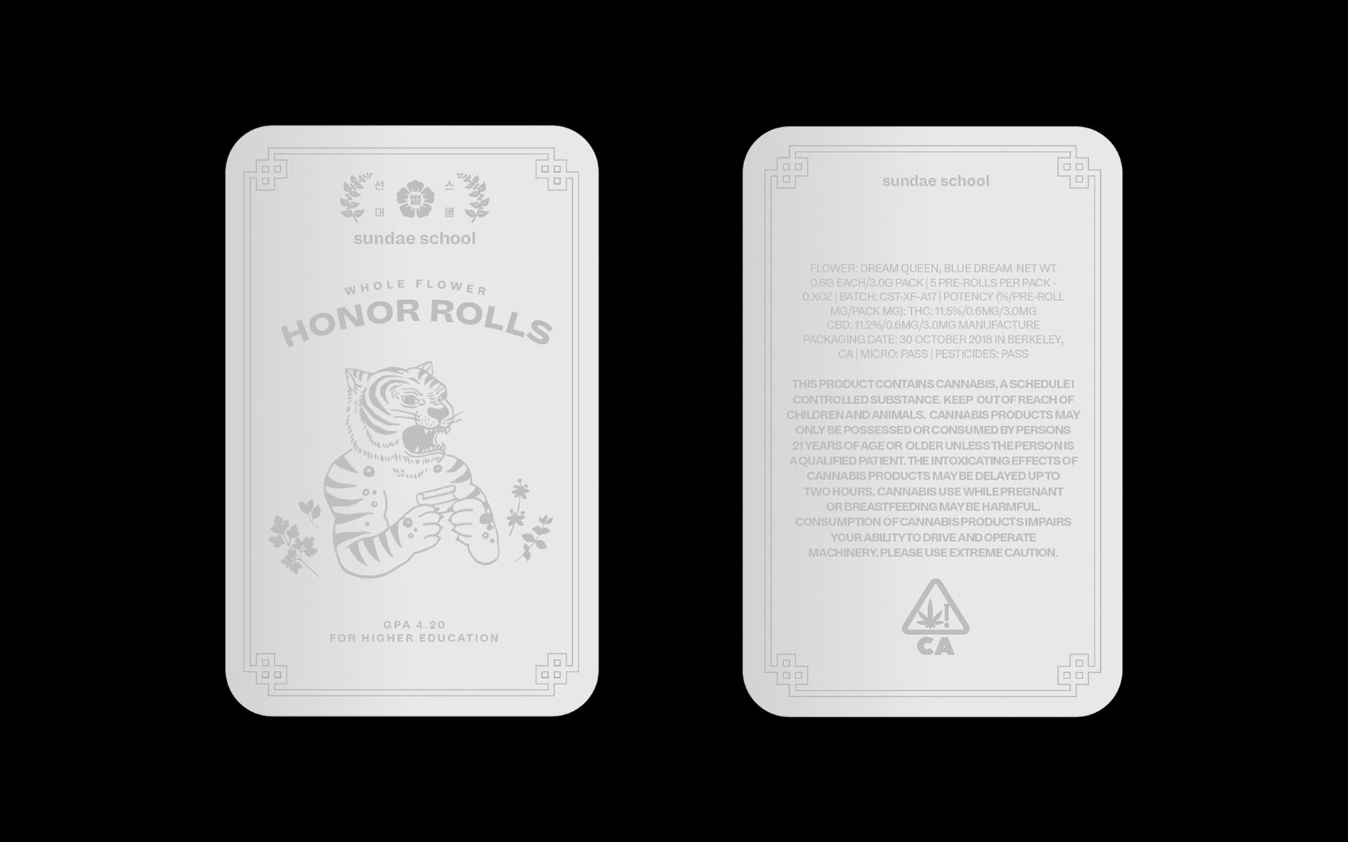 Packaging design for cannabis lifestyle brand Sundae School. Embossed tin packaging design with designer Min Ryung Son. Belly band design by Philip Kim. Creative direction by Dae Lim.